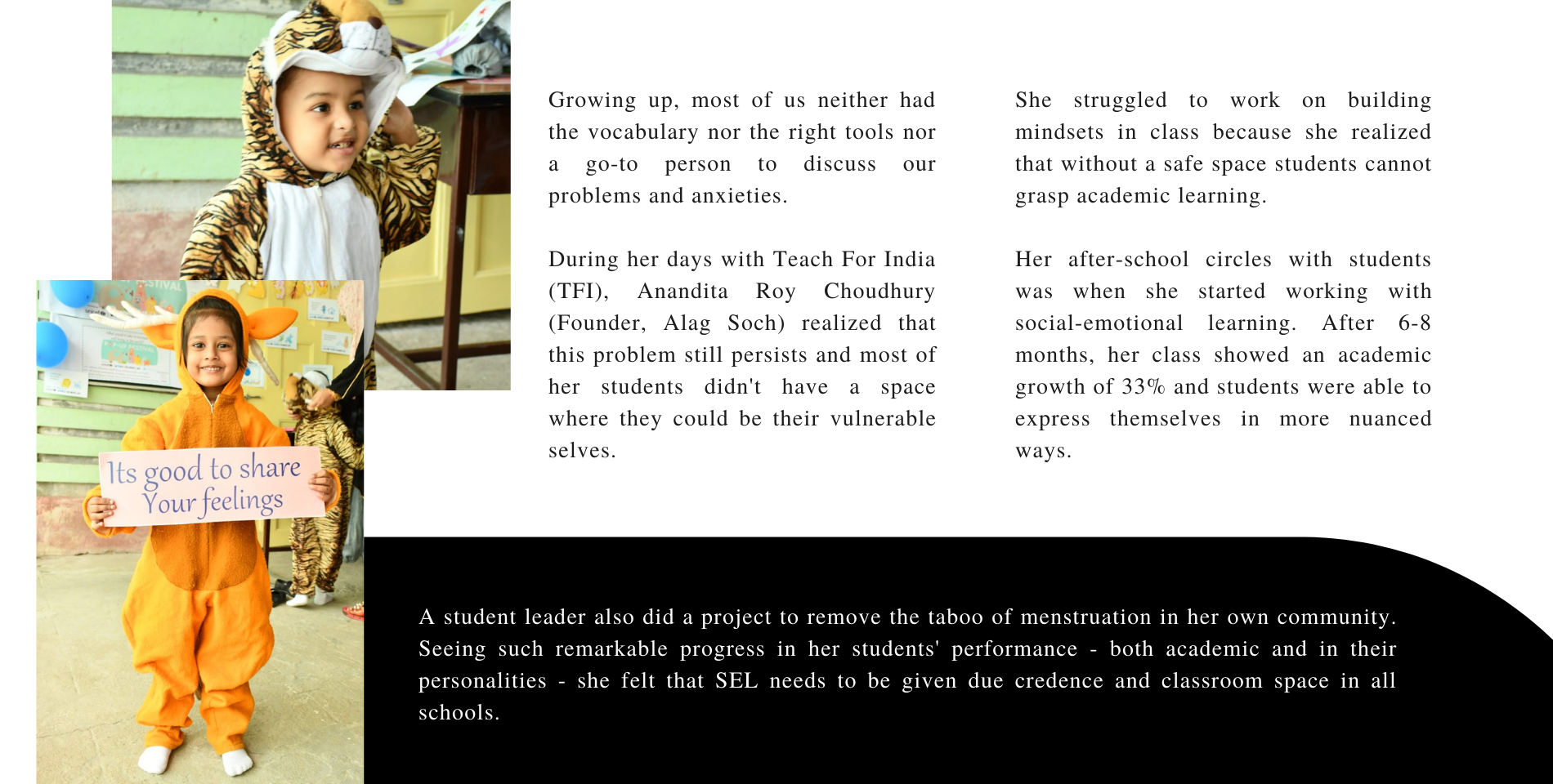 A chance late-night conversation with Anandita, the Founder of Alag Soch spurred Shuvam to formally join Alag Soch in April’20 and the journey has been rather eventful and packed so far.<br>Learning needs to be made more contextual and relevant, development-focussed, and more capability-inducing. Alag Soch dovetails into this ecosystem by complementing status quo education with the benefits of SEL.